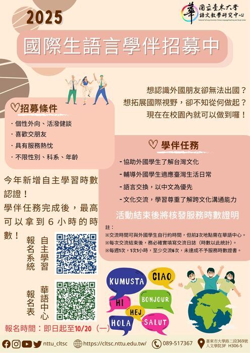 【人文學院】華語中心 114-1學年度國際語言學伴計畫
